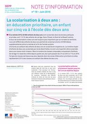 À la rentrée 2015, 93 600 enfants de deux ans sont scolarisés dans les écoles publiques et privées, soit 11,5 % des enfants de cet âge. Dans l'Ouest, le Nord et le Massif central, le taux de scolarisation à deux ans est toujours plus important que sur le reste du territoire. L'accueil différé des enfants de deux ans permet de scolariser environ 20 000 élèves supplémentaires entre la rentrée et la fin de l'année scolaire.Une école accueillant des enfants de deux ans en scolarise en moyenne six. Le nombre moyen d'enfants de deux ans scolarisés par école étant faible, ils sont une majorité à être scolarisés dans une classe multi-niveaux. Mais le nombre de classes composées uniquement d'enfants de cet âge n'a cessé de croître depuis quatre ans, leur part passant de 2 % en 2012 à 7 % en 2015. Ce type de classes est beaucoup plus répandu dans les zones d'éducation prioritaire où elles représentent 20 % des classes accueillant des élèves de deux ans.