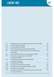 12.1 : La population scolaire et de l'enseignement supérieur dans les DOM : évolution. 12.2 : Le premier degré dans les DOM. 12.3 : Le second degré dans les DOM. 12.4 : Les flux d'élèves dans le second degré dans les DOM. 12.5 : Les spécialités de formation dans le second cycle professionnel dans les DOM (CAP, bacs professionnels + BMA). 12.6 : L'origine sociale des élèves du second degré dans les DOM. 12.7 : Les étudiants du supérieur dans les DOM-COM et en Nouvelle-Calédonie. 12.8 : Les étudiants des universités dans les DOM-COM et en Nouvelle-Calédonie. 12.9 : Les diplômes dans les DOM. 12.10 : La réussite au baccalauréat dans les DOM. 12.11 : Les enseignants du second degré public dans les DOM. 12.12 : Les personnels dans les DOM. 12.13 : La population scolaire et de l'enseignement supérieur dans les COM et en Nouvelle-Calédonie.
