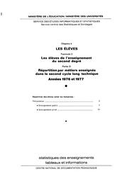 Statistiques des enseignements : Tableaux et informations . Chapitre 4, Les élèves. Fascicule 3, Les élèves de l'enseignement du second degré . Partie D, Répartition par métiers enseignés dans le second cycle long technique : année scolaire 1976-1977 / Ministère de l'éducation. Service des études informatiques et statistiques