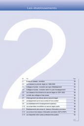 Ecoles et classes : évolution du nombre d'écoles jusqu'en 2001-2002; du nombre de classes, du nombre moyen d'élèves par classe du premier degré jusqu'en 1999-2000. Classes du premier degré en 1999-2000. Nombre moyen d'élèves par classe. Collèges et lycées : évolution du nombre d'établissements par type, du nombre de divisions du second degré, du nombre moyen d'élèves par division jusqu'en 2001-2002. Evolution du nombre de divisions et du nombre moyen d'élèves par division selon le cycle. Classes et divisions du second degré en 2001-2002. La taille des collèges et des lycées. L'hébergement des élèves dans le second degré. L'enseignement privé sous contrat et hors contrat. Les établissements d'enseignement supérieur : évolution du nombre d'établissements de 1993-94 à 2001-2002 ; établissements par type et par académie en 2001-2002. Les ensembles immobiliers du second degré public. Etablissements des zones et réseaux d'éducation prioritaire à la rentrée 2001. (France, académies, DOM). Nombre d'établissements entrant ou sortant de l'éducation prioritaire à la rentrée 2001 ; établissements en éducation prioritaire selon le type de commune. Les disparités entre lycées professionnels publics en 2001-2002 : indicateurs sur la population scolaire, la taille des lycées et la structure du corps enseignant, la performance au baccalauréat de la session 2001.