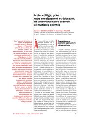 Education & Formations : 60 : juillet-septembre 2001. Chap. 7, Ecole, collège, lycée : entre enseignement et éducation, les aides-éducateurs assurent de multiples activités. / Laurence Diederichs-Diop et Dominique Fournie