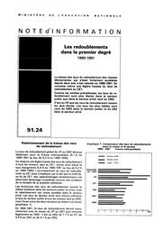 Evolution 1980-1981 à 1990-1991 des taux de redoublement au CP et CM2. Taux de redoublement par secteur et classe. Taux de redoublement dans les académies et les départements : CP-CM2 public et privé, CP au CM2 public-privé. Flux public vers privé par classe, dont redoublants. Intégration des élèves de l'enseignement spécial.