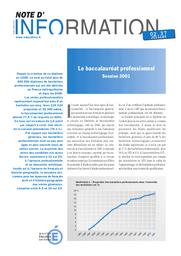 Evolution des résultats du baccalauréat professionnel de 1987 à 2001 : présentés, admis, pourcentages, par sexe. Session 2001 : admis par secteur et selon les principales spécialités ; admis par sexe et selon les spécialités ; bacheliers des baccalauréats général, technologique, professionnel par âge (graphique), par catégorie socioprofessionnelle. Répartition cumulée (en %) des candidats au baccalauréat professionnel selon leurs notes en français et histoire-géographie, épreuve professionnelle, épreuve scientifique et technique, éducation artistique, éducation physique et sportive. Graphique : proportion des bacheliers professionnels dans l'ensemble des bacheliers. Encadrés : spécialités et options ; l'examen du baccalauréat professionnel.