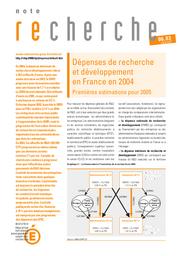 En 2004, la dépense intérieure de recherche et développement (DIRD) s'établit à 35,5 milliards d'euros, la hausse en volume, après une année de baisse, s'établissant à 1,1 % par rapport à 2003. Pour 2005, la DIRD augmenterait pour atteindre 36,4 milliards d'euros, soit une augmentation de 0,5 % en volume. La part de la DIRD dans le PIB s'établit à 2,14 %. Les entreprises et le marché public contribuent à part égale à l'augmentation de la DIRD, mais les travaux de recherche sont plus importants dans les administrations. En 2004, les effectifs de recherche et développement (R&D) progressent ; c'est l'effectif de chercheurs qui augmente, alors que les autres personnels de R&D diminuent. L'activité de recherche se concentre dans quelques secteurs d'activité comme l'automobile qui demeure la première branche de recherche ; la quatrième branche, les dépenses en aéronautique et spatiale, progressent le plus. L'activité publique de recherche est marquée par une progression des EPIC.