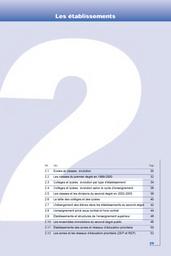Ecoles et classes : évolution du nombre d'écoles jusqu'en 2002-2003; du nombre de classes, du nombre moyen d'élèves par classe du premier degré jusqu'en 1999-2000. Classes du premier degré en 1999-2000. Nombre d'écoles selon le nombre de classes. Collèges et lycées : évolution du nombre d'établissements par type, du nombre de divisions du second degré, du nombre moyen d'élèves par division jusqu'en 2002-2003. Evolution du nombre de divisions et du nombre moyen d'élèves par division selon le cycle. Classes et divisions du second degré en 2002-2003. La taille des collèges et des lycées. L'hébergement des élèves dans le second degré. L'enseignement privé sous contrat et hors contrat. Les établissements d'enseignement supérieur : évolution du nombre d'établissements de 1994-95 à 2002-2003 ; établissements par type et par académie en 2001-2002. Les ensembles immobiliers du second degré public. Etablissements des zones et réseaux d'éducation prioritaire à la rentrée 2002. (France, académies, DOM). Nombre d'établissements entrant ou sortant de l'éducation prioritaire à la rentrée 2002 ; établissements en éducation prioritaire selon le type de commune. Nombre et proportion d'élèves en éducation prioritaire, par académie, à la rentrée 2002.