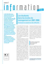 En 2007-2008, 90 800 étudiants suivent une formation dans l'une des 207 écoles de management, soit 4,3 % des effectifs de l'enseignement supérieur. 85 % de ces étudiants sont inscrits dans une école reconnue par l'Etat (123 établissements). Les académies de Paris, Versailles, Lyon et Bordeaux accueillent la moitié de ces étudiants. La part des femmes dans les écoles de management s'élève à 48 % (56 % dans l'ensemble de l'enseignement supérieur). Le recrutement de ces écoles s'étant diversifié au fil des ans, à la rentrée 2007, les nouveaux bacheliers représentaient 23 % du vivier, suivis des étudiants venant de l'université, des élèves de CPGE et enfin des titulaires d'un BTS ou d'un DUT. Répartition des étudiants par formation et par groupe (les écoles sont classées en trois groupes), par académie, des nouveaux inscrits selon l'origine scolaire ; évolution depuis 2000 des effectifs, de la proportion d'étudiantes, de celle d'étudiants étrangers.