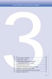 Le premier degré en 1999-2000 par sexe, classe et niveau d'enseignement. Evolution de 1960-61à 2001-2002 ; par département et académie en 2001-2002 (en raison des grèves, nous ne disposons pas des effectifs d'élèves de nombreux départements du public). Le préélémentaire en 2001-2002 ; évolution depuis 1960 des pourcentages d'enfants scolarisés par âge. L'élémentaire par âge, classe et sexe ; évolution depuis 1960, pour le CP et le CM 2, évolution de la proportion d'élèves en retard. Les langues vivantes au cours moyen en 2001-2002. L'enseignement spécialisé du premier degré (évolution depuis 1980-81) ; répartition par sexe et âge depuis 1984-85. Elèves handicapés scolarisés dans l'enseignement ordinaire. Les élèves de nationalité étrangère ; évolution des effectifs depuis 1975-76. L'évaluation en début de CE2.