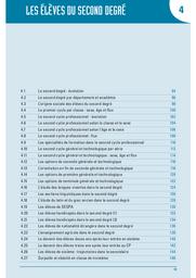 4.1 Le second degré : évolution (depuis 1960). 4.2 : par département et académie. 4.3 : l'origine sociale des élèves. 4.4 : LE PREMIER CYCLE par classe : sexe âge et flux. 4.5 : LE SECOND CYCLE PROFESSIONNEL : évolution (depuis 1970) ; 4.6 : selon la classe et le sexe ; 4.7 : selon l'âge et le sexe ; 4.8 : flux. 4.9 : Les spécialités de formation dans le second cycle professionnel (CAP, baccalauréats professionnels + BMA) - NSF. 4.10 : LE SECOND CYCLE GENERAL ET TECHNOLOGIQUE : par série (évolution en graphiques depuis 1994) ; 4.11 : sexe, âge, flux. 4.12 : Les options de seconde générale et technologique. 4.13 : L'orientation en fin de seconde générale et technologique. 4.14 : Les options de première générale et technologique. 4.15 : Les options de terminale générale et technologique. 4.16 : l'étude des langues vivantes dans le second degré. 4.17 : les sections linguistiques dans le second degré : européennes et internationales. 4.18 : l'étude du latin et du grec ancien. 4.19 : les élèves de SEGPA. 4.20 : les élèves handicapés dans le second degré : âge, sexe, déficience ; 4.21 : type d'établissement et déficience ; élèves en ULIS. 4.22 : les élèves de nationalité étrangère dans le second degré. 4.23 : l'enseignement agricole dans le second degré, résultats aux examens en 2010. 4.24 : Le devenir des élèves douze ans après leur entrée en sixième (panels 1989, 1995). 4.25 : devenir des élèves treize ans après leur entrée au CP (panels 1995, 1997). 4.26 : Les élèves de sixième : trajectoires dans le secondaire. 4.27 : surpoids et obésité chez les adolescents scolarisés en classe de troisième en 2003-2004 (enquête DREES).