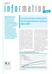 Pendant l'année universitaire 2008-2009, 92 400 enseignants ont été en fonction dans les établissements publics d'enseignement supérieur. Huit tableaux font apparaître le nombre d'enseignants et enseignants-chercheurs en fonction selon leur grade, la discipline, le type d'établissement, par tranche d'âges et par sexe, les enseignants titulaires d'un corps du second degré, une étude et comparaison des effectifs et de l'âge moyen de recrutement, du stock et des départs en retraite, une répartition par académie des enseignants en activité. En graphiques : évolution de l'effectif des personnels de 1992 à 2009 ; proportion de femmes parmi les enseignants-chercheurs, par tranche d'âges et discipline. En encadré : sources et méthode.