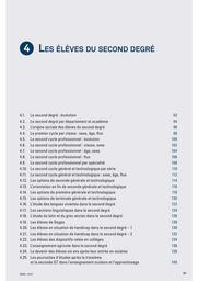 4.1 Le second degré : évolution depuis 1990. 4.2 : par département et académie. 4.3 : l'origine sociale des élèves du 2nd degré. 4.4 : LE PREMIER CYCLE par classe : sexe, âge et flux. 4.5 : LE SECOND CYCLE PROFESSIONNEL : évolution depuis 1995 ; 4.6 : diplôme préparé, sexe ; 4.7 : âge, sexe ; 4.8 : flux. 4.9 : par spécialité de formation (CAP, baccalauréats professionnels + BMA). 4.10 : LE SECOND CYCLE GENERAL ET TECHNOLOGIQUE : par série évolution en graphiques depuis 1994 ; 4.11 : sexe, âge, flux. 4.12 : Les options de seconde générale et technologique. 4.13 : L'orientation en fin de seconde générale et technologique. 4.14 : Les options de première générale et technologique. 4.15 : Les options de terminale générale et technologique. 4.16 : l'étude des langues vivantes dans le second degré. 4.17 : les sections linguistiques dans le second degré. 4.18 : l'étude du latin et du grec ancien dans le 2nd degré. 4.19 : les élèves de SEGPA. 4.20 : les élèves en situation de handicap dans le second degré : âge, type d'accompagnement, déficience ; 4.21 : type de formation et déficience ; effectifs en ULIS. 4.22 : les élèves des dispositifs relais en collège. 4.23 : l'enseignement agricole dans le second degré. 4.24 : Le devenir des élèves six ans après leur entrée en sixième (panels 1995, 2007). 4.25 : les poursuites d'études après la troisième et la seconde GT dans l'enseignement scolaire et l'apprentissage.