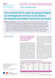 Chapô : Dans le second degré,toutes les heures de cours ne sont pas dispensées en classe entière : un tiers des heures d'enseignement s'effectuent devant des groupes d'élèves plus réduits. L'effectif moyen des groupes d'élèves auquel fait face un enseignant du second degré varie en fonction du niveau et du secteur d'enseignement. Par exemple, un enseignant de collège ou de lycée d'enseignement général et technologique est face à 24 élèves en moyenne, tandis qu'un enseignant de lycée professionnel est face à 16 élèves en moyenne. Cet effectif moyen varie aussi en fonction de la taille et de la composition sociale de l'établissement.