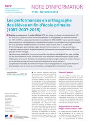Évalués en cours moyen 2e année (CM2) en 2015, les élèves, entrés en cours préparatoire (CP) en 2010 pour la plupart, ont de moins bons résultats en orthographe que les élèves évalués en 1987 et 2007. La baisse des résultats constatée entre 1987 et 2007 n'a ainsi pas été enrayée. Les compétences orthographiques mesurées dans le cadre d'une dictée diminuent globalement : en 2015, les élèves font en moyenne 17,8 erreurs contre 14,3 en 2007 et 10,6 en 1987. C'est l'orthographe grammaticale (règles d'accord entre le sujet et le verbe, accords dans le groupe nominal, accords du participe passé) qui demeure la source principale de difficultés pour les écoliers français.Le phénomène est général, il concerne l'ensemble des élèves, quel que soit leur sexe, leur âge ou leur environnement social. Il touche aussi tous les secteurs de scolarisation (public, privé et éducation prioritaire). Toutefois, en éducation prioritaire, l'augmentation du nombre d'erreurs sur la dernière période est moins importante que dans les autres secteurs. L'augmentation sensible du nombre d'erreurs s'est accompagnée d'une plus grande disparité des résultats, avec de moins en moins d'élèves orthographiant correctement le texte.