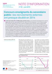 Chapô : Au titre de l'année 2014, 25 600 postes ont été ouverts au recrutement d'enseignants du second degré public par les voies externe (81,5%), interne (7,5 %) et réservée (11 %). La mise en place d'un nouveau calendrier pour 2014 a permis d'organiser deux sessions, dites exceptionnelle et rénovée, doublant l'offre de postes aux concours externes. Ces concours ont attiré beaucoup plus de candidats, quand bien même 39 % des présents aux concours exceptionnels ont choisi de se présenter une nouvelle fois aux concours rénovés pour augmenter leurs chances de réussite. De plus, l'ouverture des concours aux étudiants inscrits en master 1 a contribué à élargir le vivier de candidats. Le nombre de présents pour un poste (hors candidatures multiples) est resté stable entre 2013 et 2014, malgré ce contexte de forte augmentation du nombre de postes. Les recrutements ont progressé de près de 80 % par rapport à 2013. C'est aux Capes externes de mathématiques, d'anglais et de lettres modernes que la crise du recrutement demeure la plus forte : 41 % de postes vacants en mathématiques.Résumé :25 600 postes ont été ouverts aux différents concours enseignants du second degré public en 2014. La mise en place d'un nouveau calendrier pour 2014 a permis d'organiser deux sessions, dites exceptionnelle et rénovée. Elles ont attiré beaucoup plus de candidats, le vivier des candidats s'élargissant avec l'ouverture des concours aux étudiants inscrits en master 1. Les recrutements "réels", en supprimant les multi-admissions, ''élèvent à 15 000 personnes, ce qui représente quasiment le double de l'année 2013. En encadré : définitions, source et champ de l'enquête.