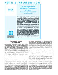 Premier degré : par type d'établissement, effectif d'élèves en 1992-93, 1993-94, 1994-95, nombre d'établissements; répartition par cycle, par âge (graph.); par déficience : élèves accueillis ou scolarisés par type d'établissement; handicapés intégrés ; classes d'adaptation, RASED, écoles spécialisées. Second degré : par type d'établissement, effectif d'élèves en 1994-95, par cycle ; élèves par âge et par sexe ; formation professionnelle, par sexe et par secteur de formation (graph.) ; origine scolaire des élèves de SES-SEGPA (graph.). Disparités géographiques : part de l'enseignement spécial, part du MEN dans l'enseignement spécial.