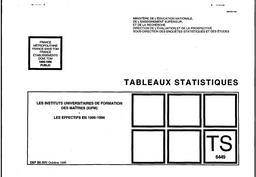 Evolution des effectifs depuis 1991-1992 : par type de préparation et niveau de scolarité ; par IUFM. Tableau de synthèse des effectifs par France et établissements : niveau de scolarité ; concours de recrutement et niveau de scolarité ; type de préparation et niveau de scolarité. Etablissements : effectifs détaillés par niveau de scolarité, type de préparation et concours de recrutement. A partir d'un échantillon : concours préparés et concours obtenus par spécialité et sexe ; autre scolarité poursuivie par les étudiants de 1ère année et les stagiaires ; situation antérieure à la 1ère et 2ème années ; formation universitaire des étudiants de 1ère année ; discipline des licences des étudiants de 1ère année par type de concours préparé ; âge des 1ère et 2ème années par sexe ; étudiants et stagiaires répartis par Français, étrangers (union européenne). PRE-RECRUTES : concours envisagé par secteur disciplinaire de la licence préparée ; par sexe ; âge. ALLOCATAIRES : répartion des effectifs de l'année préparatoire par niveau de scolarité et concours envisagé ; allocataires de 1ère année par concours préparé et spécialité.