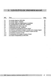 Le premier degré en 1995-1996 ; évolution depuis 1960-61. Le premier degré par département et académie. Le préélémentaire en 1995-1996 ; évolution depuis 1960. L'élémentaire par classe et par sexe. L'élémentaire par âge ; évolution depuis 1960. L'enseignement spécialisé du premier degré (évolution depuis 1980) ; répartition par sexe depuis 1985. Les élèves de nationalité étrangère (secteur privé) ; évolution des effectifs depuis 1960. Les compétences en lecture et en calcul à l'entrée en CE2. L'évaluation à l'entrée en CE2. L'enseignement des langues vivantes à l'école. Les classes transplantées en 1994-1995.