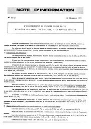 France métropolitaine : pour l'élémentaire, évolution des effectifs, par classe, de 1969-70 à 1975-76. Situation d'ensemble du 1er degré, par niveau : préélémentaire, CP à CM 2, classes de fin d'études, public, privé, total, % privé. PRIVE : France métro, DOM : nombre d'écoles et de classes, élèves par niveau et classe. Par académie : élèves en préélémentaire, en élémentaire, en classes de fin d'études, en initiation, rappel 1974-75. Part du privé.