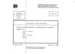 Résultats aux examens du technique de la session 1971, selon l'origine scolaire des présentés et des reçus par sexe et spécialité, selon le mode d'obtention du diplôme. Le document recense les CAP, BEP, BP, BT, BEI, BSEC, BTn et BTS.