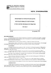 Recrutement et effectifs des élèves des écoles normales d'instituteurs et des centres régionaux de formation en 1970-71 / Ministère de l'éducation nationale. Direction chargée de la prévision. Service central des statistiques et sondages
