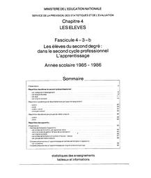 Statistiques des enseignements : Tableaux et informations : édition 1987. Chapitre 4, Les élèves. Fascicule 4-3-b, Les élèves du second degré : dans le second cycle professionnel. L'apprentissage - Année scolaire 1985-86. / Ministère de l'éducation nationale. Direction de l'évaluation et de la prospective