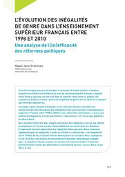 Education & formations : L'égalité entre les filles et les garçons, entre les femmes et les hommes, dans le système éducatif : n° 96 mars 2018. Article 06, L’évolution des inégalités de genre dans l'enseignement supérieur français entre 1998 et 2010 : une analyse de l’(in)efficacité des réformes politiques / Magali Jaoul-Grammare