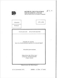Enquête de rentrée dans les établissements publics du second degré ; répartition des élèves par classe et catégorie d'établissement. 1971-72.