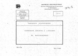 Répartition des candidats incrits au baccalauréat général et bac de technicien en 1974. Variation entre 1973 et 1974 par option et filières. Effectifs par académie, et inscription dans les centres d'examens à l'étranger.