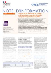 Anglais en fin d’école et de collège : une hausse du niveau des élèves en compréhension de l’oral en 2022 / Yann Eteve, Marguerite Garnero, Damien Laflaquière, Louis Philbert, Hugo Rogie, DEPP B2-1 et B2-2