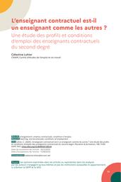 La contractualisation de l’enseignement fait référence à la pratique consistant à recruter des enseignants sur la base de contrats (souvent temporaires) plutôt que sous le statut de fonctionnaire. Au coeur de débats publics récents, les enseignants contractuels restent pourtant encore assez mal connus. À travers une analyse des données provenant des enquêtes Emploi de 2013 à 2020, ce travail met en lumière les profils spécifiques des enseignants contractuels du second degré public : à la fois plus jeunes, moins diplômés et plus souvent d’origine étrangère, ils se distinguent aussi de leurs homologues titulaires par les voies par lesquelles ils rejoignent la profession enseignante. Les emplois