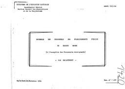 Répartition des personnels non-enseignants dans les établissements publics du second degré : lycées classiques, modernes et techniques, collèges d'enseignement technique, écoles normales d'instituteurs et d'institutrices. Répartition par académie, département de la France métropolitaine et des DOM.