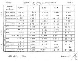 Elèves inscrits dans le second degré public, répartis par type d'établissements, par académie et département en 1965-66. Les effectifs d'élèves des lycées comportent les effectifs des classes primaires. Effectifs totaux par département et académie pour la France métropolitaine et les DOM.