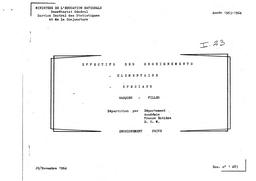 Effectifs d'élèves scolarisés dans l'enseignement élémentaire et spécial privé en 1963-64. Répartition par sexe, par académie et département de la France métropolitaine et dans les DOM. Effectifs du CP au CM2, et au-delà du CM2.