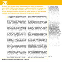 Les indicateurs 26 à 28 ont été retenus pour rendre compte des activités de la recherche. Indicateur 26 : la France dans l'espace européen de la recherche via sa participation au PCRD. Indicateur 27 : les coopérations public/privé pour innover en France. Indicateur 28 : la recherche en biotechnologie dans les entreprises.