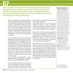 Les indicateurs 7 à 14 ont été retenus pour rendre compte des activités de l'enseignement supérieur. Indicateur 7 : la réussite au baccalauréat. Indicateur 8 : l'accès à l'enseignement supérieur. Indicateur 9 : le recrutement des principales filières du supérieur. Indicateur 10 : la scolarisation dans l'enseignement supérieur. Indicateur 11 : les étudiants étrangers dans l'enseignement supérieur. Indicateur 12 : les filles et les garçons dans l'enseignement supérieur. Indicateur 13 : études et emploi du temps. Indicateur 14 : la formation continue dans l'enseignement supérieur.Il existe une version en anglais.