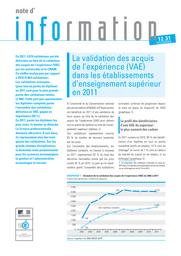 En 2011, 4 019 validations ont été délivrées au titre de la validation des acquis de l'expérience (VAE) par les universités et le CNAM.Validation des acquis de l'expérience et des acquis professionnels par université et pour le CNAM ; évolution de 2002 à 2011 : répartition des bénéficiaires selon leur situation vis-à-vis de l'emploi, selon la catégorie socioprofessionnelle. En 2011 : selon les diplômes accordés et l'âge, selon les différents diplômes obtenus, selon les disciplines universitaires. En encadrés : l'accompagnement en VAE, les dispositifs de validation des acquis, source.