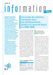 Au cours de l'année scolaire 2008-2009, les établissements publics du second degré ont déclaré en moyenne 10,5 incidents graves pour 1000 élèves. Le taux est de 3,6 pour 1000 en LEGT, de 12 pour 1000 en collège et 13,1 pour 1000 en lycée professionnel. Les violences physiques et verbales représentent les trois quarts des incidents recensés ; les atteintes aux biens ou à la sécurité sont plus fréquentes dans les lycées ; les élèves sont auteurs de plus de huit actes graves sur dix et sont victimes quatre fois sur dix, l'implication des garçons est nettement supérieure à celle des filles. En encadrés : taux de réponse à l'enquête SIVIS ; taux d'implication.