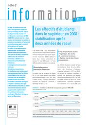 En 2008, le nombre d'étudiants dans l'enseignement supérieur est demeuré à son niveau de 2007, mettant ainsi fin à deux années de diminution. Cette diminution affecte surtout les universités, alors que les écoles d'ingénieurs et les écoles de commerce reconnues à diplôme visé demeurent particulièrement attractives. Cinq tableaux mettent en lumière les effectifs de l'enseignement supérieur, en évolution, par type d'établissement et avec la part des femmes, les principales contributions aux évolutions entre 2007 et 2008, la répartition des effectifs universitaires (hors IUT) selon le cursus depuis 2004-2005, la répartition par académie des principales filières de l'enseignement supérieur en 2008-2009, le poids des différentes filières du supérieur. Six graphiques illustrent l'évolution des effectifs de l'enseignement supérieur, l'évolution des enseignements privé et public depuis 1998, la part des filles dans les différentes formations, la part des étudiants à l'université par académie, la proportion d'étrangers et leur répartition par continent d'origine.