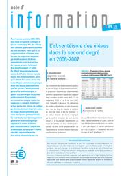 Pour l'année scolaire 2006-2007, tous mois et types d'établissements confondus, 5 % des élèves sont absents quatre demi-journées ou plus par mois. L'absentéisme augmente au cours de l'année scolaire, mais reste stable d'une année sur l'autre. Les collèges connaissent deux fois moins d'absentéisme que les lycées d'enseignement général et technologique et quatre fois moins que les lycées professionnels. En encadrés : la notion d'absentéisme ; définitions autour de l'absentéisme ; le temps d'enseignement non assuré durant l'année scolaire 2006-2007 ; gestion des absences et prévention de l'absentéisme ; présentation des enquêtes.
