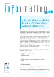 Présentée selon le thème abordé, cette liste regroupe les notes d'information publiées par la direction de l'évaluation, de la prospective et de la performance au cours de l'année 2007 et des années précédentes. Ces notes portent essentiellement sur les années scolaires de 2003-2004 à 2006-2007. De 2003 à 2007 sont éditées des Notes Evaluation qui synthétisent les travaux d'évaluation des résultats du système éducatif et qui sont diffusées aux établissements du second degré, et des Notes Recherche qui font le point sur certains aspects de la recherche française.
