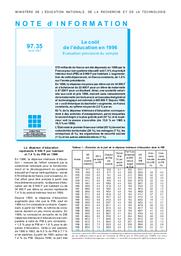 DEPENSE D'EDUCATION en 1995 : dépense moyenne par élève, coût de quelques scolarités types (maternelle, primaire, 2nd degré général, technique ou professionnel, supérieur) ; dépense pour les activités d'éducation ; coûts de production des activités ; financement de la dépense d'éducation. Sources, définitions, méthodologie. Le COMPTE DE L'EDUCATION SUPERIEURE (France métro). COMPTES ANNUELS de 1992 à 1995 (définitifs pour 1992, provisoires pour les autres années) : dépenses courantes, en capital, et totales ; financement des activités d'éducation et des achats des biens et services liés ; financement du secteur de production ; dépenses des producteurs par activité ; transferts entre les unités de financement ; dépenses en métropole et dans le reste du monde. Les comptes provisoires de 1993 et 1994 ont évolué par rapport à la précédente édition et seront définitifs lors des prochaines éditions. Evolution de la part de la dépense intérieure d'éducation (DIE) dans le PIB de 1974 à 1995, avec indication de la croissance annuelle.