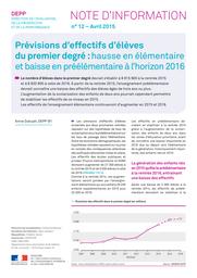 Le nombre d'élèves dans le premier degré devrait s'établir à 6 815 900 à la rentrée 2015 et à 6 820 800 à celle de 2016. À partir de la rentrée 2015, l'enseignement pré-élémentaire devrait connaître une baisse des effectifs des élèves âgés de trois ans ou plus. L'augmentation de la scolarisation des enfants de deux ans pourrait cependant permettre de stabiliser les effectifs de ce niveau en 2015. Les effectifs de l'enseignement élémentaire continueront d'augmenter en 2015 et 2016.