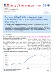 Le nombre d'élèves dans le premier degré devrait s'établir à 6 791 700 à la rentrée 2017 et à 6 761 600 à celle de 2018 ; il était de 6 806000 à la rentrée 2016, stable par rapport à 2015. À la rentrée 2017, le nombre d'élèves dans le premier degré devrait baisser pour la première fois depuis 2011, essentiellement pour des raisons démographiques. Cette baisse devrait continuer à la rentrée 2018. Elle affectera aux deux rentrées les niveaux préélémentaire et élémentaire. La baisse en préélémentaire devrait être particulièrement importante à la rentrée 2018.