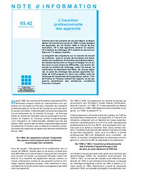Répartition des apprentis sortis au cours ou en fin d'année 1992-93 par situation au 1er février 1994 et par niveau de sortie. Evolution de leur situation, emploi ou chômage, par diplôme de 1990 à 1994 ; évolution de l'indicateur de chômage comparant les élèves ayant obtenu un CAP soit en lycée professionnel, soit par apprentissage, depuis février 1990 (graphique). Indicateur de chômage selon les spécialités de formation (graphique). Taux de chômage des apprentis au 1er février 1994 à la fin d'un CAP en deux ans, par académie (carte). Encadrés : l'enquête ; définitions.
