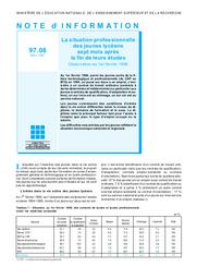 Entrée dans la vie active des jeunes sortis des lycées et LP à la fin de l'année scolaire 1994-95. Type de contrat de travail ("non-aidé", particulier...). Importance du niveau de diplôme et du diplôme, discrimination par sexe, rapport au salaire mensuel moyen, adéquation au type d'emploi occupé. Recherche d'emploi, taux de chômage par sexe. Insertion selon le domaine de formation, selon les académies. Encadrés : comparaison avec l'enquête Emploi de l'INSEE ; l'enquête IVA ; définitions.