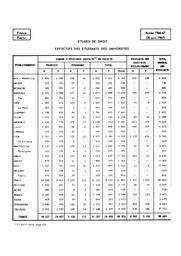 Répartition des étudiants en 1966-67, français, étrangers, par sexe par université et discipline, grades et diplômes préparés. Le premier fichier concerne le droit, le second concerne les sciences, le troisième les lettres et sciences humaines, le quatrième la médecine, le cinquième la pharmacie et l'odontologie.