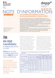 À la session 2024 du diplôme national du brevet (DNB), 84 000 candidats se sont présentés à la série professionnelle. Parmi eux, 80 100 candidats étaient inscrits dans une classe de collège à la rentrée 2023, 1 500 dans une classe préparant au baccalauréat professionnel, 500 dans une classe de CAP et 2 000 candidats n’ont pas été retrouvés dans les bases de données permettant d’identifier leur scolarité.