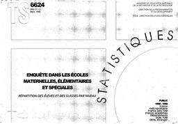 France métro, France sans TOM, France, académies, départements, DOM et TOM : répartition des élèves par classe et par niveau, par type d'école, nombre moyen d'élèves par classe (distinction entre classes à un seul cours et à plusieurs cours). Note : les effectifs de la Nouvelle-Calédonie sont ceux de la rentrée de mars 1998 ; 22 écoles des Hauts-de-Seine ont fait l'objet d'estimations par l'inspection académique.