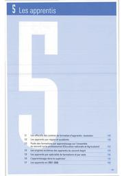 5.1 : Les effectifs des centres de formation d'apprentis : évolution (1995-1996 à 2006-2007). 5.2 : Les apprentis par région et académie en 2006-2007. 5.3 : Poids des formations par apprentissage sur l'ensemble du second cycle professionnel (Éducation nationale et Agriculture) en 2006-2007. 5.4 : Les origines scolaires des apprentis du second degré en 2006-2007 (cursus 2 et 3 ans). 5.5 : Les apprentis par spécialité de formations et par sexe en 2006-2007. 5.6 : L'apprentissage dans le supérieur (1995-1996 à 2006-2007). 5.7 : Les apprentis en 2007-2008 (résultats provisoires).