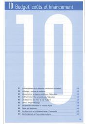10.1 : Le financement de la dépense intérieure d'éducation. 10.2 : Le budget : analyse et évolution. 10.3 : L'évolution de la dépense intérieure d'éducation. 10.4 : Le financement des producteurs d'éducation. 10.5 : Les dépenses par élève et par étudiant. 10.6 : La taxe d'apprentissage. 10.7 : Les bourses nationales du second degré. 10.8 : L'aide aux étudiants. 10.9 : Les boursiers sur critères sociaux à l'université. 10.10 : L'action sociale en faveur des étudiants.