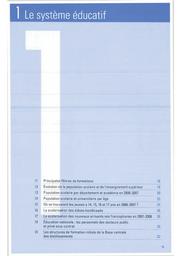 1.1 : Principales filières de formations. 1.2 : Évolution de la population scolaire et de l'enseignement supérieur. 1.3 : Population scolaire par département et académie en 2006-2007. 1.4 : Population scolaire et universitaire par âge. 1.5 : Où se trouvaient les jeunes à 14, 15, 16 et 17 ans en 2006-2007 ? 1.6 : La scolarisation des élèves handicapés. 1.7 : La scolarisation des nouveaux arrivants non francophones en 2007-2008. 1.8 : Éducation nationale : les personnels des secteurs public et privé sous contrat. 1.9 : Les structures de formation initiale de la Base centrale des établissements.